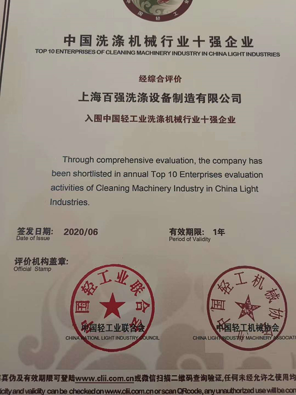 本次會議還經行了十強企業授牌儀式,上海百強洗滌設備制造有限公司再度入圍中國輕工業洗滌機械行業十強企業!